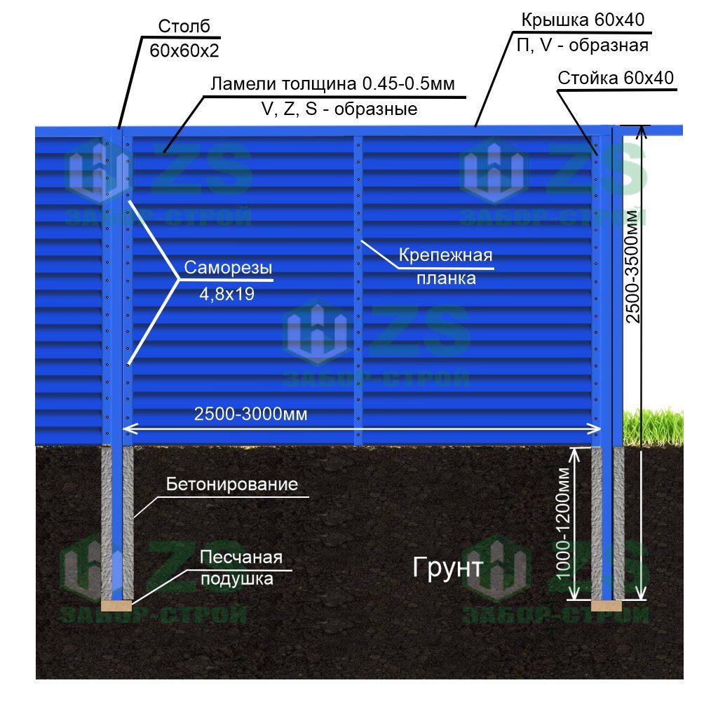 Конструкция забора жалюзи с бетонированием столбов: